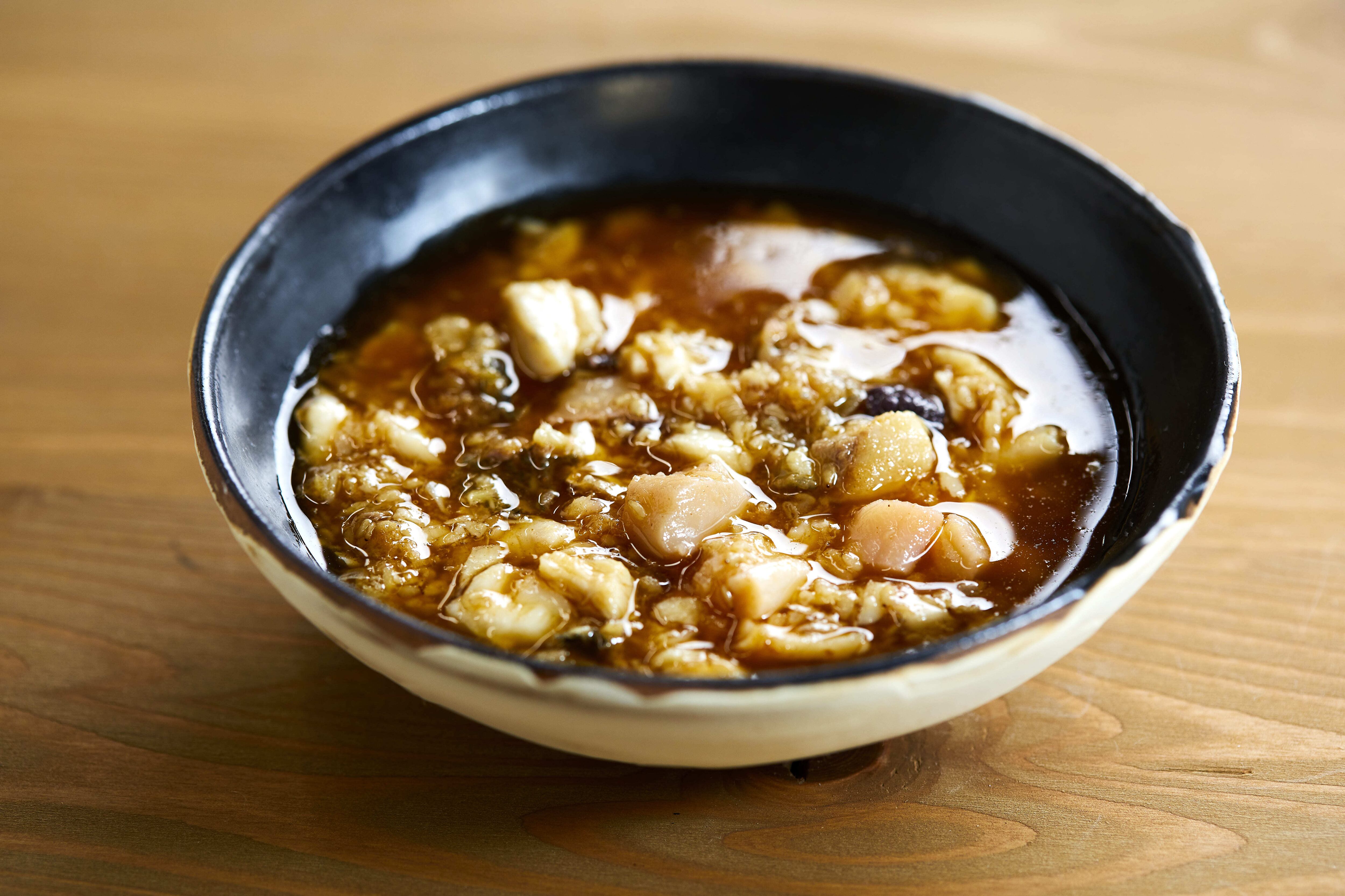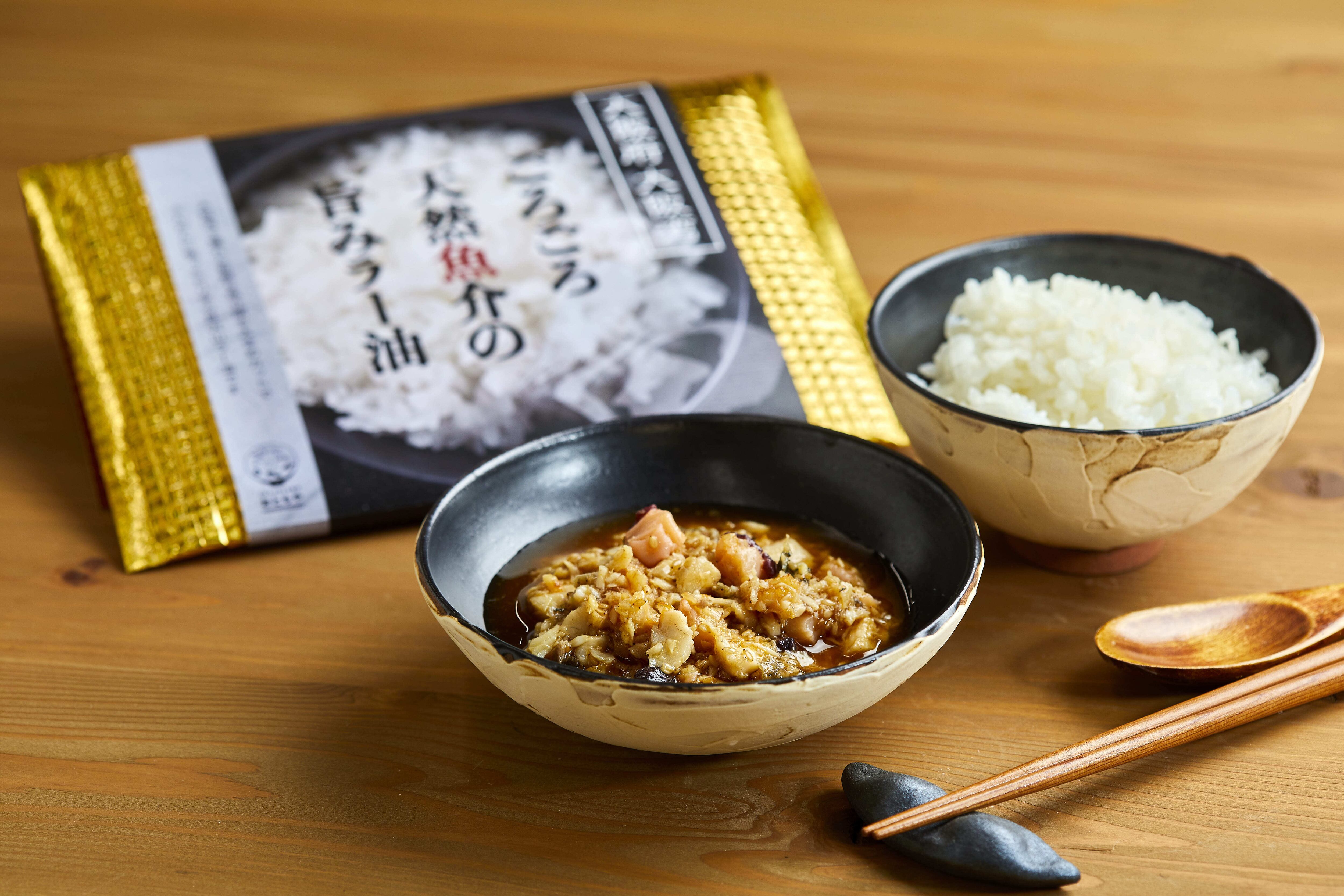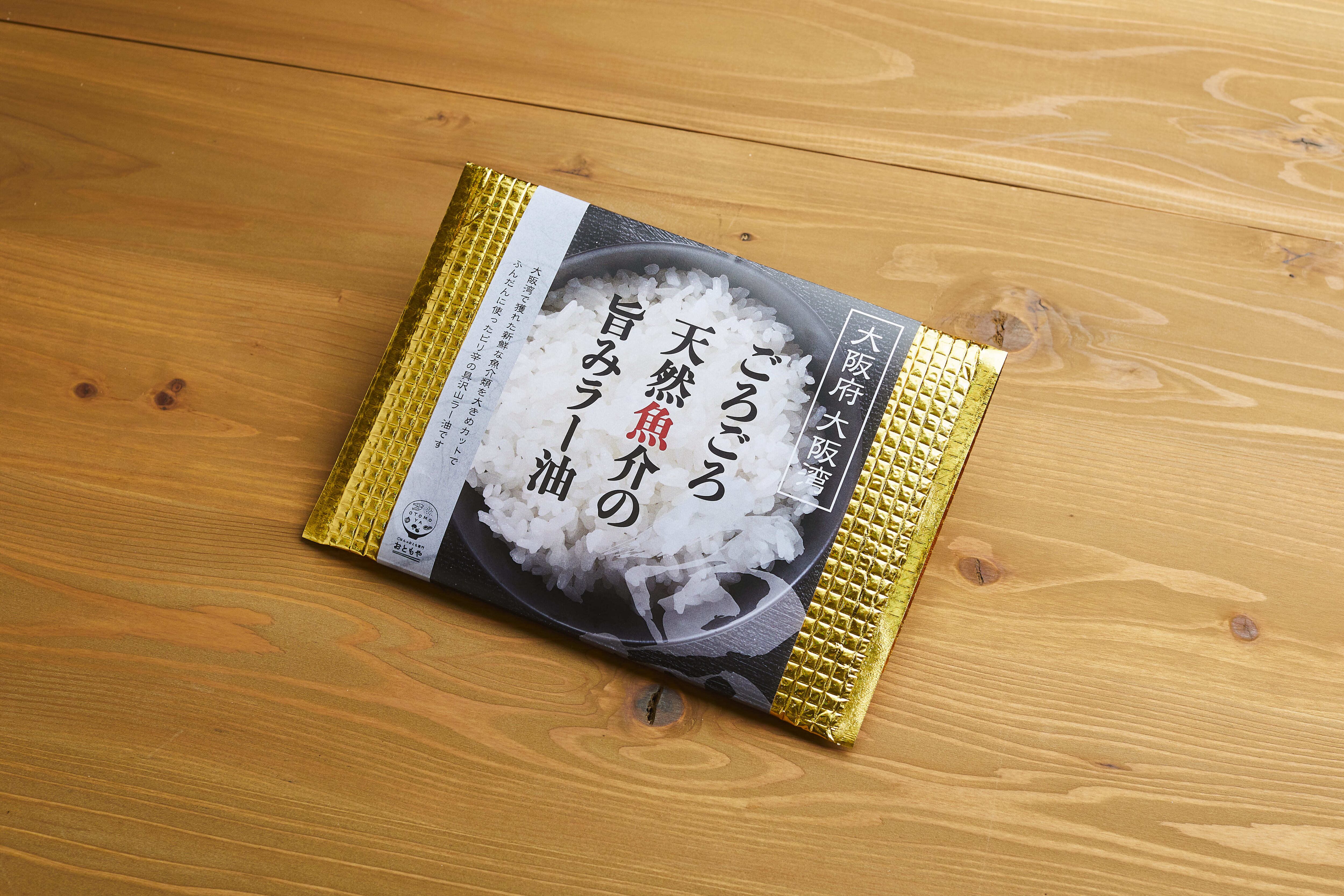 大阪湾で獲れた新鮮な魚介類を大きめカットでふんだんに使ったピリ辛の具沢山ラー油です。